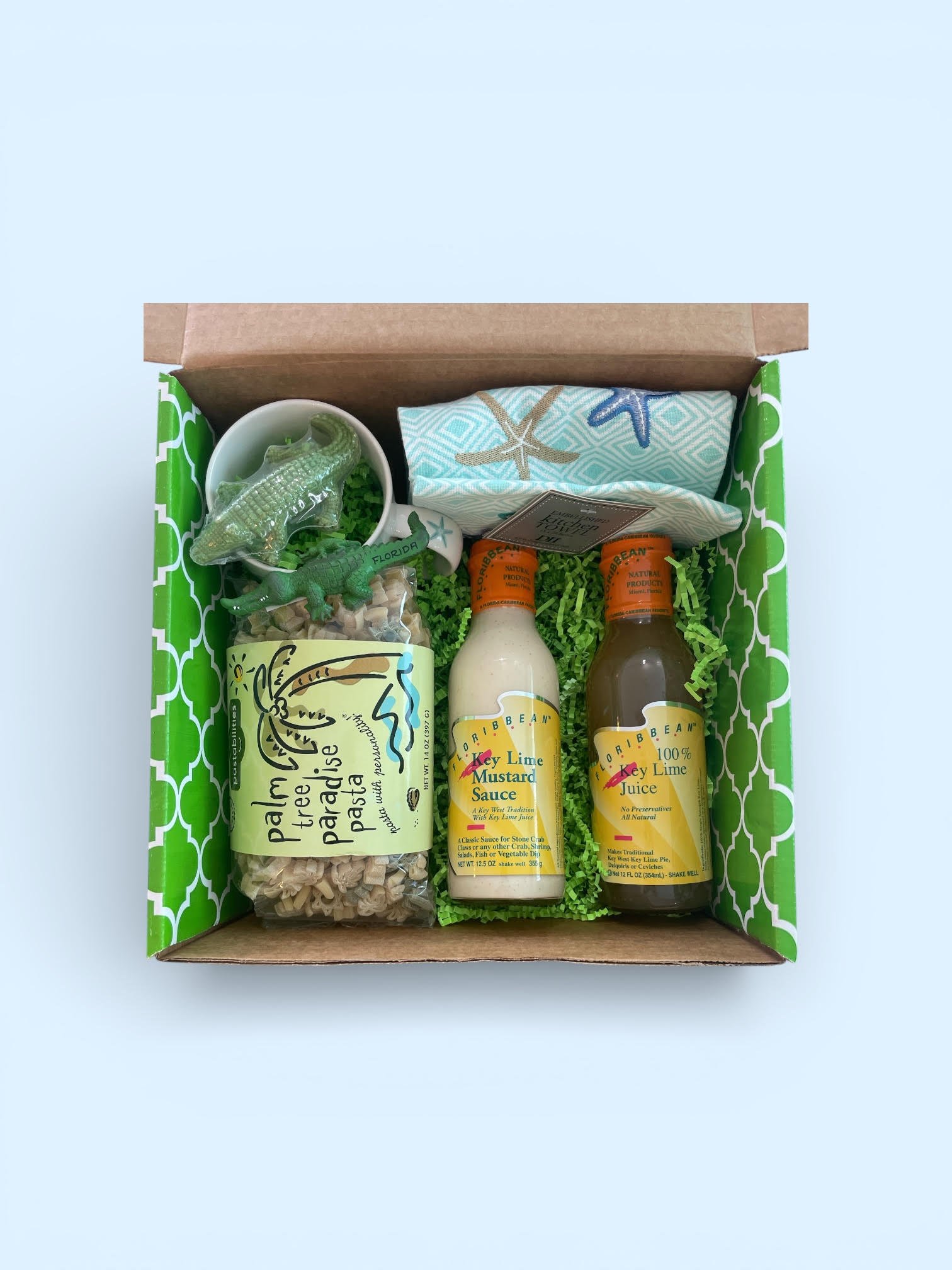 The Perfect Florida Gift! This assortment includes a Mug, a Key Lime Mustard Sauce, Key Lime Juice, Florida gator soap, a themed Kitchen towel, and a Tropical Pasta (either Flamingo or Palm Tre).